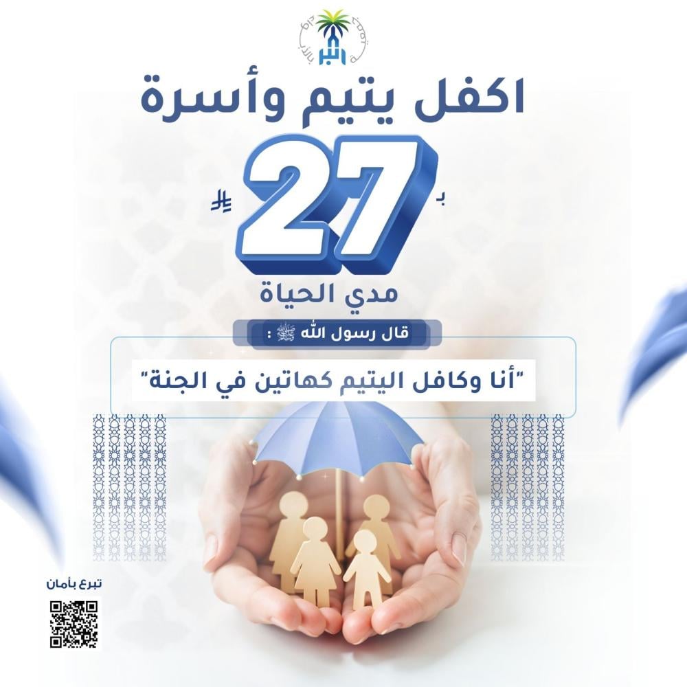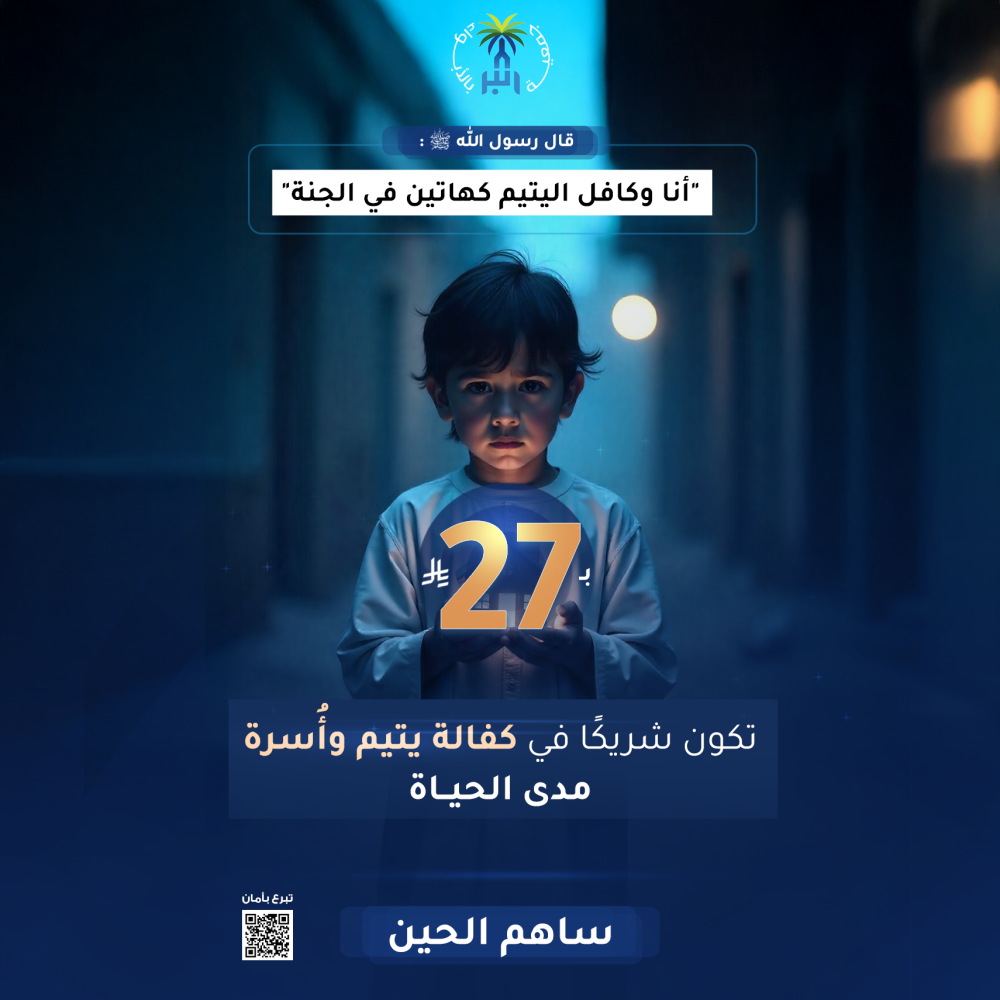 تبرعك اليوم يبدأ من 27 ريال فقط… لكنه يفتح باب أجر لا ينقطع، لأنه يتحول مباشرة إلى كفالة يتيم ورعاية أسرة متعففة.